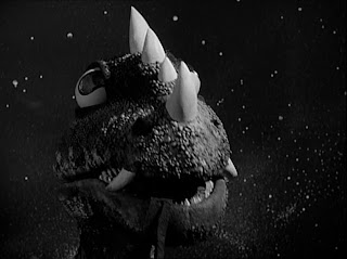 This edition of the late Gerry Anderson's Supermarionation spacestravaganza sees the crew of spaceship XL2 trapped in a cave on the planet Monotane by the monster of the title - a cute, boggle-eyed dino who I'm sure is just trying to be friendly.