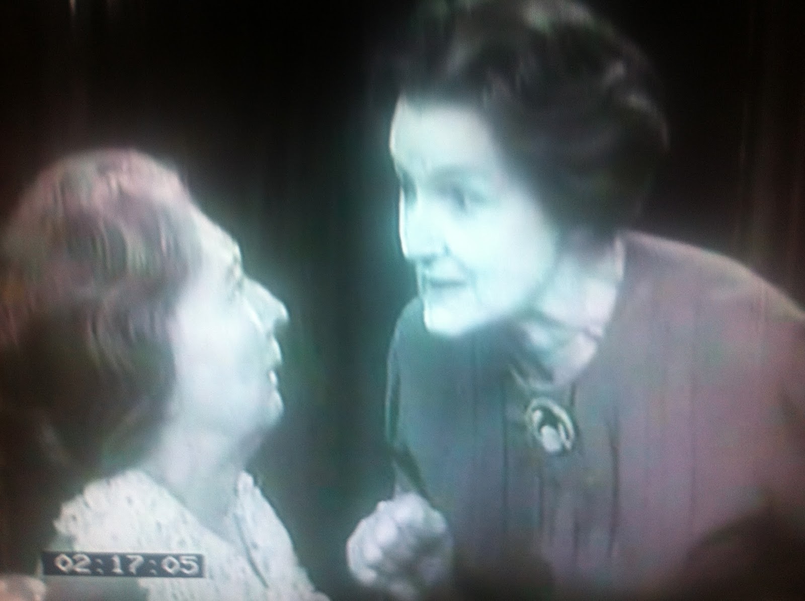 But Janet and Mr Gordon are right to suspect something's wrong: Mrs Elgin's obsession has developed into a full-blown mania, and she's virtually keeping her fragile sister prisoner in her room to prevent her from spreading dirt to the rest of the house and the outside world. Tiny Esma Cannon, like a trapped bird, is perfect casting as the helpless victim of domestic tyranny, and Mary Hinton's clearly having a whale of a time with Flora's demonic rages: "You're not fit to be seen! I won't have this house disgraced!" Flora's reign of terror eventually culminates in her burning all but one set of Harriet's clothes in order to stop her leaving them lying around.